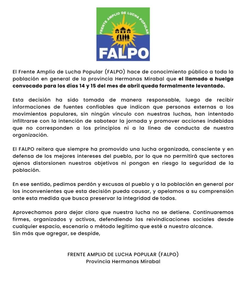 El Frente Amplio de Lucha Popular (FALPO) informó la noche del martes, el levantamiento de la huelga convocada para los días 14 y 15 de abril en la provincia Hermanas Mirabal, tras alegar la existencia de intentos de infiltración por parte de personas ajenas al movimiento.