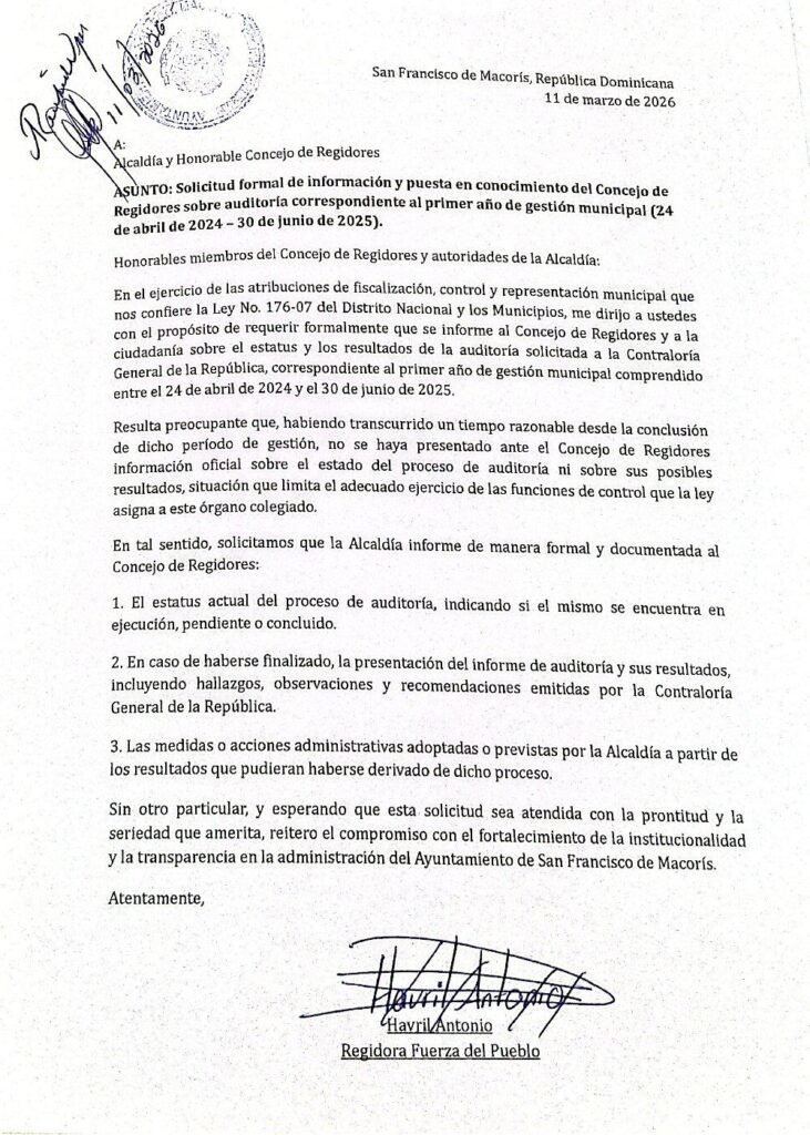 Mediante una comunicación fechada el 11 de marzo de 2026 en San Francisco de Macorís, la edil pidió que se ponga en conocimiento del Concejo de Regidores el estatus de la auditoría solicitada a la Contraloría General de la República, correspondiente al período comprendido entre el 24 de abril de 2024 y el 30 de junio de 2025.